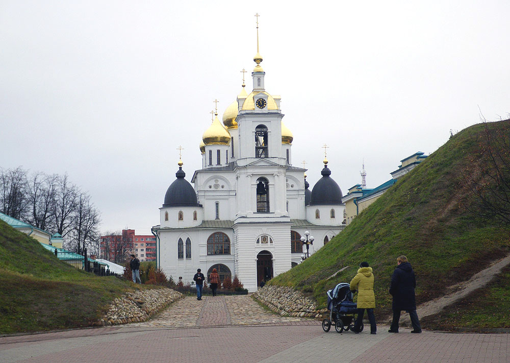 Дмитров – древний русский город, основанный князем Юрием Долгоруким в 1154г. Центр и самое древнее место Дмитрова – дмитровский Кремль. Кремль окружен со всех сторон высоким земляным валом, сохранившимся еще с домонгольских времен. По верху вала стояли деревянные укрепления с 8 башнями. Перед валом с трех сторон был вырыт ров, с четвертой стороны естественной преградой была старица реки Яхромы. Деревянные укрепления, разрушенные во время польско-литовской интервенции начала XVIIв., в дальнейшем не возобновлялись. Архитектурной доминантой Кремля является Успенский собор, выстроенный из кирпича между 1509 и 1533г. Пятиглавый четырехстолпный храм крестовокупольного типа поставлен на белокаменных подвалах. Прясла стен, обработанных филенками, отделены от закомар карнизами. В наружный декор введены монументальные изразцовые композиции. Два барельефа с Распятием вставлены в тимпаны средних закомар южного и северного фасадов. Изразцы выполнены в прозрачной глазури в легких желтых тонах. Облик собора частично искажен в 1709г. переделкой позакомарного покрытия на четырехскатное и заменой каменных барабанов деревянными. В первой трети XVIIв. с трех сторон к зданию были пристроены сводчатые галереи. В 1820-1840-х гг. они были капитально перестроены архитектором Ф.М.Шестаковым в формах псевдоготики. Трехъярусная колокольня заложена в 1794г. и завершена по проекту архитектора Элькинского в 1820-х гг.