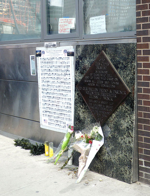 Мемориал, расположенный рядом с тем местом, где до 11 сентября 2001г. стояли башни-близнецы Всемирного Торгового центра, состоит из нескольких досок на кирпичной стене. В начале мемориала – фотографии погибших пожарных и металлический ромб с надписями «343 самым храбрым в этом городе. Памяти тех, кто пал, и тем, кто продолжает служить». Мемориал создан, судя по надписи, юридической международной фирмой «Холланд и Найт» и посвящен памяти «друга и партнера» Гленна Дж. Уайнука. Он был партнером фирмы и добровольным спасателем и пожарным и погиб 11 сентября 2001г. Кроме «Холланда и Найта» ромб подписан и пожарным департаментом Нью-Йорка.