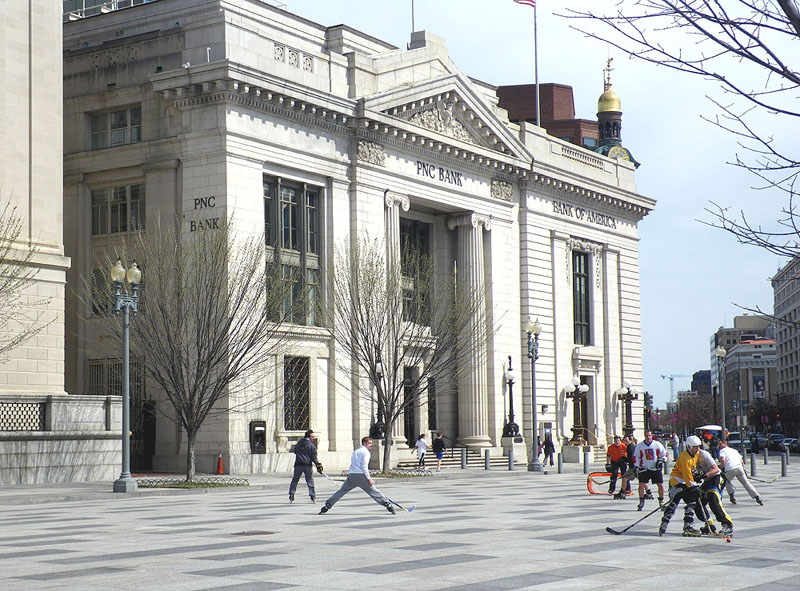 Вашингтон. Игра в хоккей с мячом у банка вблизи Белого дома